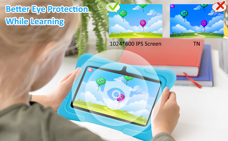 Veidoo kids tablet uses 7-inch 1024 x 600 high-definition display, presenting from all angles.