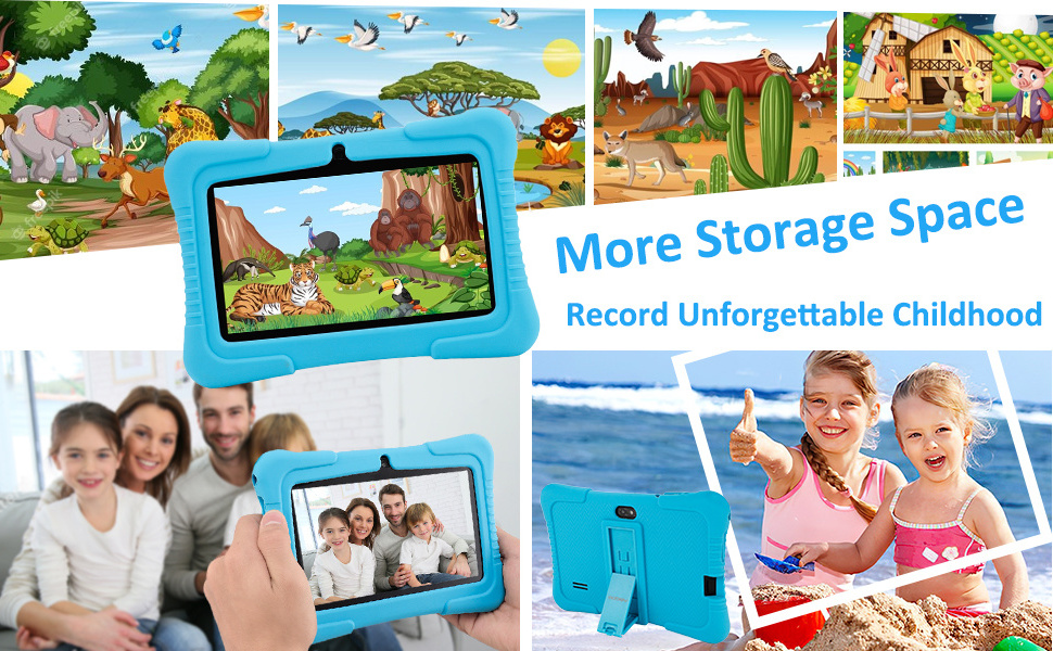 Veidoo Kids Tablet with 16G ROM can save unforgettable memories with maximum extension 64GB by SD card.