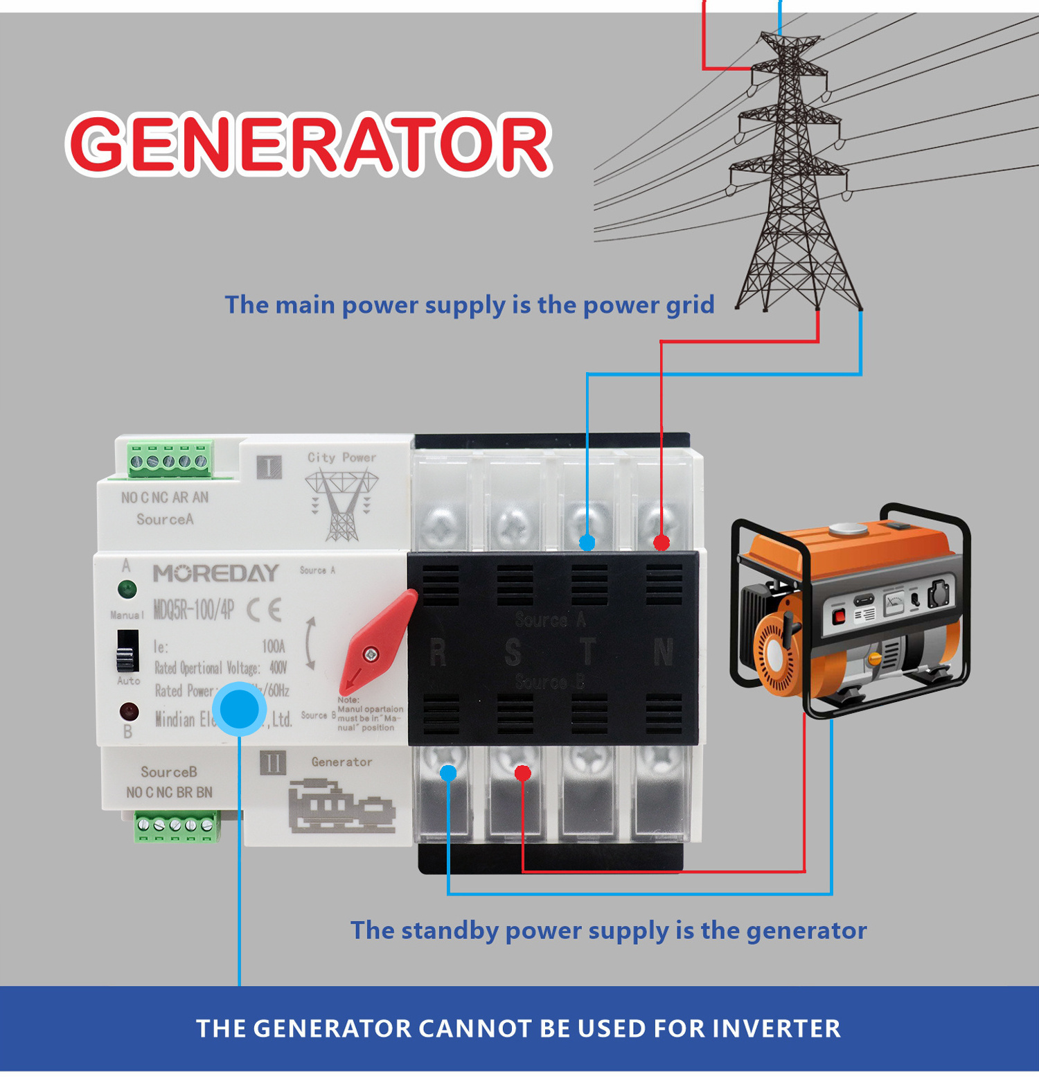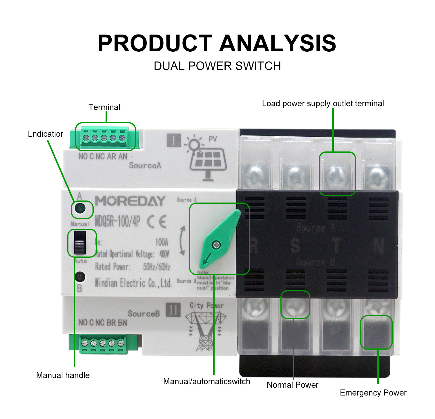 Dual Power ATS Automatic Transfer Switch for PhotovoltaicMDQ5R-100/2P 3P 4P PV/Generator type