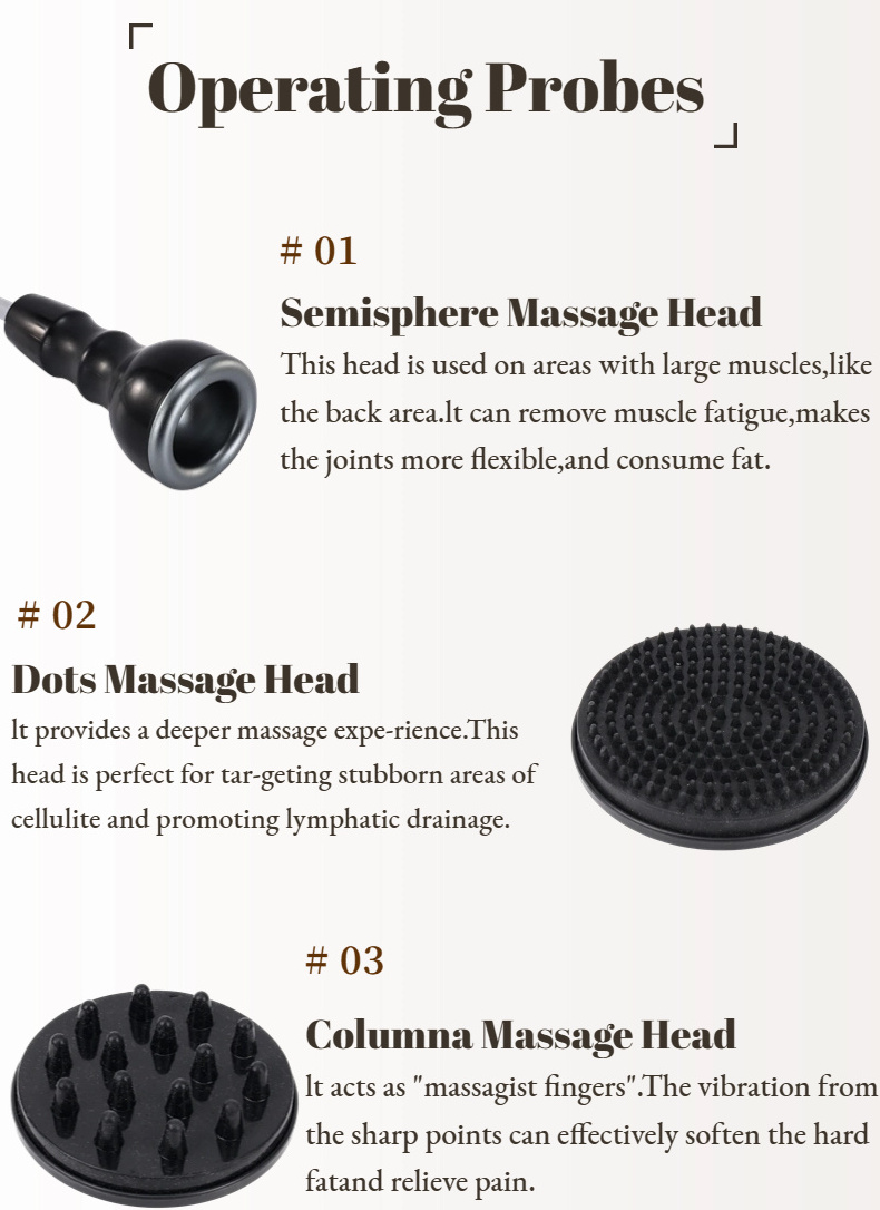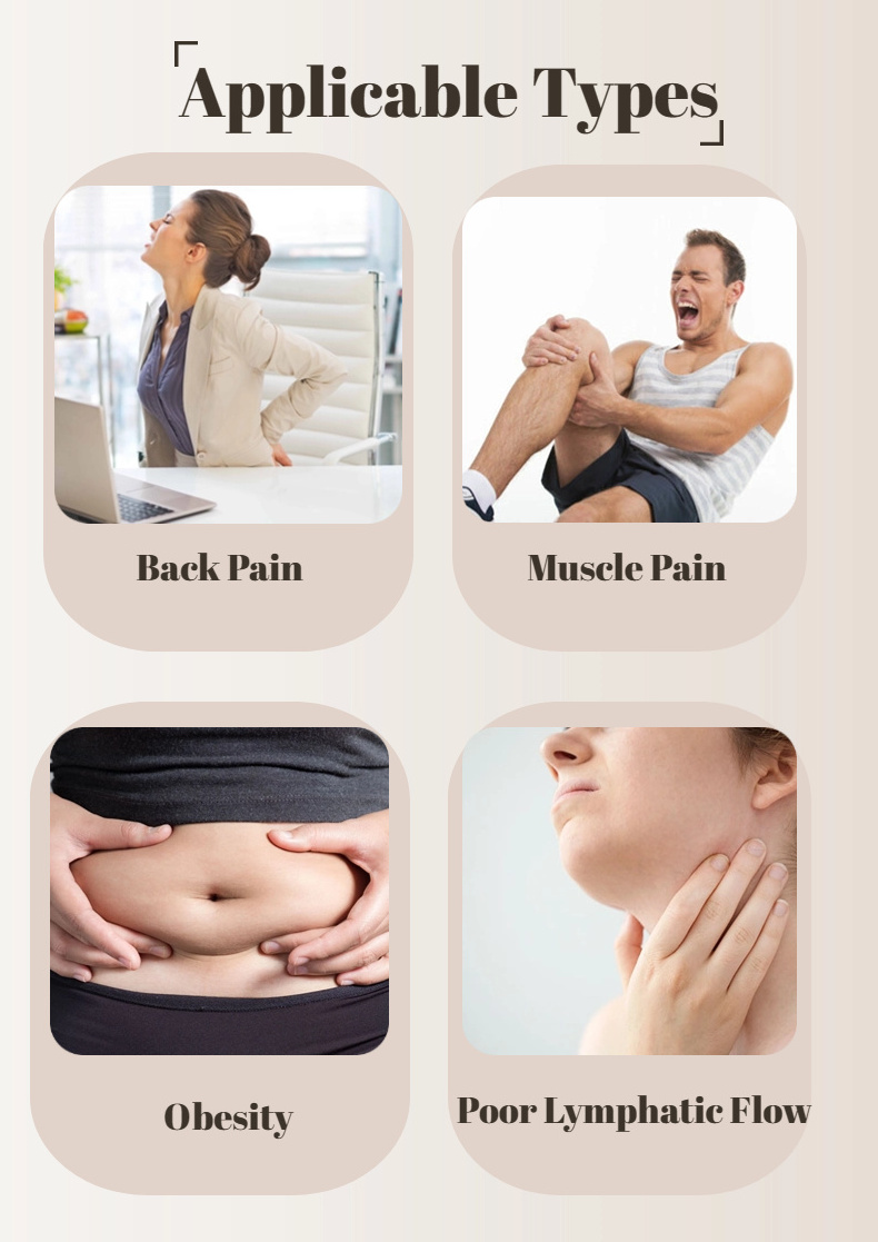 Vibration: The principle of vibration is based on the idea that mechanical vibrations can help stimulate the body's lymphatic system, which is responsible for removing waste and toxins from the body. It is effective for relaxing muscles and reducing cellulite.