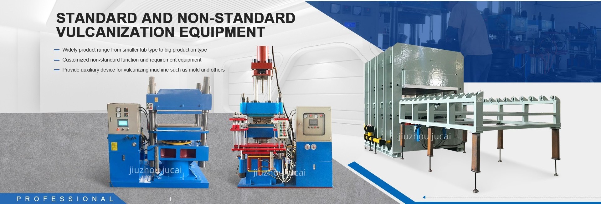 Our main products: Rubber mixing equipment: kneader, bucket,mixing mill, bale cutter . Rubber vulcanizing machine : Four-column press, Frame press, E-type press,tire and tube press,Belt vulcanizing press,rubber transfer molding machine . Automatic and semi-automatic waste tire recycling equipment .