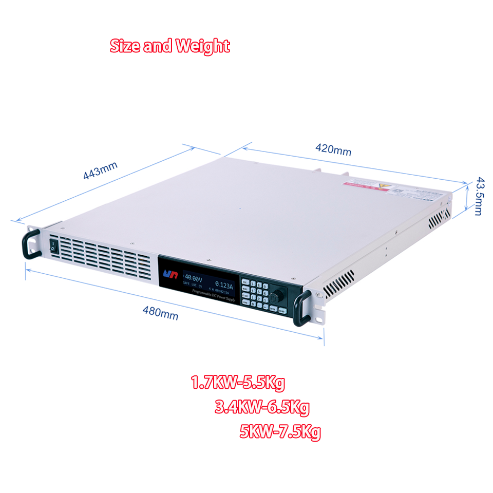 DP series high-precision programmable DC power supply is a cost-effective product with high-quality, high-power-density, multi-function, launched by our company to meet the needs of our customers. The maximum power of 1U model can reach 5KW, and the weight is only 7.5Kg. The specification voltage of this series of products can reach up to 3050V, and the maximum current can reach 525A. It built-in PFC power factor correction circuit, and the input voltage can meet the wide range of applications in the global power grid.