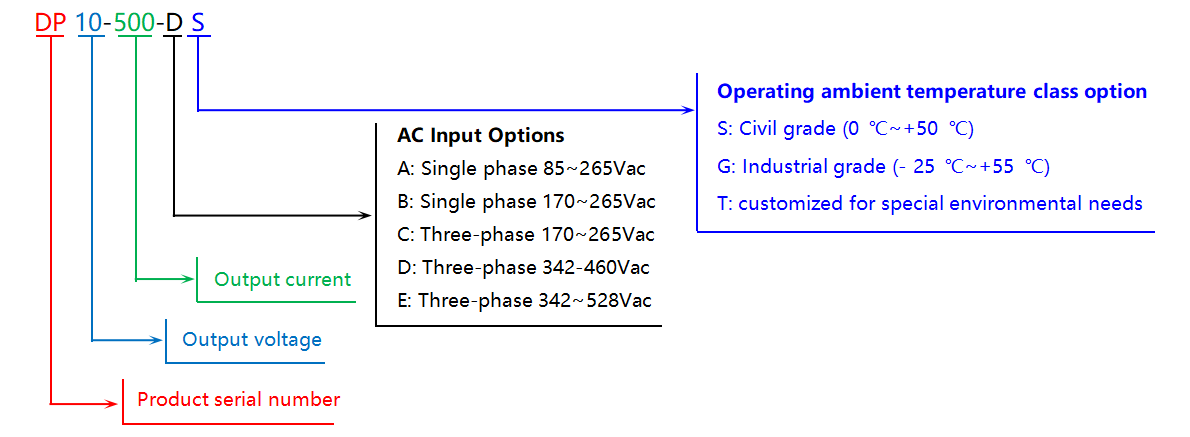 Please determine the model suffix letter according to the actual input voltage and temperature class requirements, when you place an order.