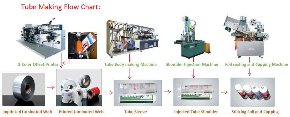 We can offer you one-step service.The whole production line including machines, raw material. This machine production line is used for making laminated tube (ABL tube and Pbl tube) ,like toothpaste tube , cream tube ,Face cream tube and other Cosmetic packageing tube .