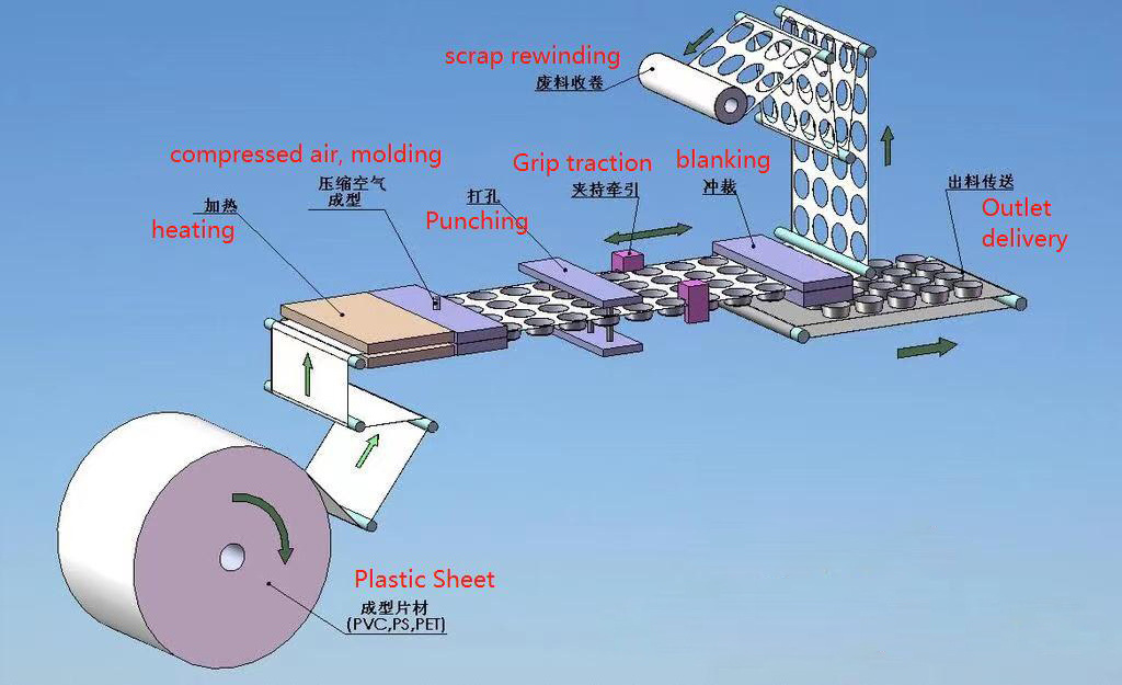 4. Positive pressure forming (blow forming). Applied to PVC, PET, PS Medical trays, beverage cup lids, food packaging
