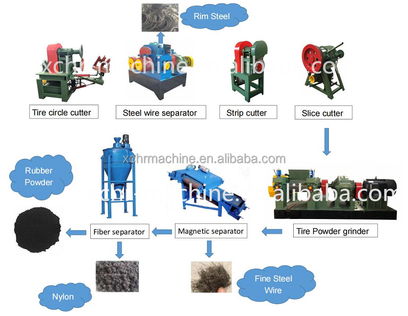 waste tire→cutting diameter of hub→cutting strips→cutting blocks→separate steel wire→crush rubber blocks→making powder→magnetic separation→final products(rubber powder)