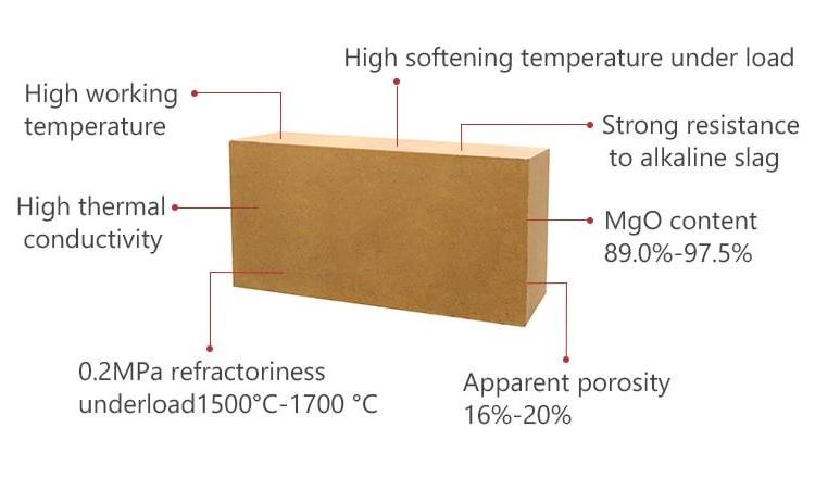 Magnesium brick is an alkaline refractory material mainly composed of magnesium oxide, with a magnesium oxide content of up to 91%, and periclase as the main crystal phase. Meanwhile, it has high refractoriness at 2000℃ (3632℉) and strong resistance to alkaline corrosion, they have excellent high-temperature mechanical strength and volume stability.