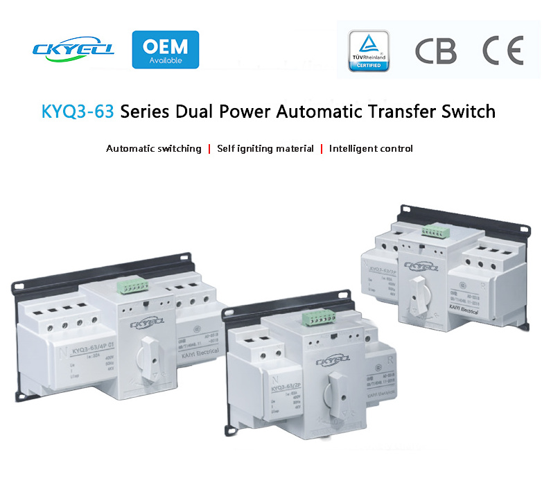 KYQ3-63 series automatic power transfer switch (hereinafter referred to as transfer switch) is suitable for dual power supply system with AC 50Hz/60, rated working voltage 400V and rated working current up to 63A. It can complete the transfer between common power supply and standby power supply by automation or manual operation. The switch is mainly used in hospitals, shops, banks, chemical industry, metallurgy, high-rise buildings, military facilities and other important occasions.