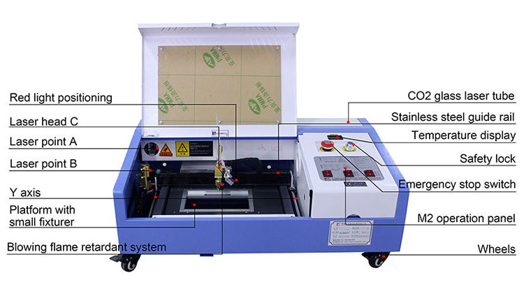 High precision laser head has long service life.It is equipped with red light indication and easy to position.It is easy to cause fire break out while processing,so it is added a flame-retardant blowing device to stop burning.