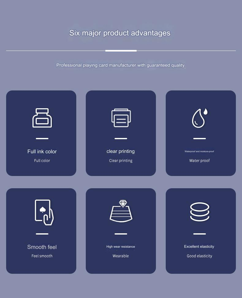 Product advantages: Our company's printing is clear, the ink color is full, the ink is firm and not easy to fall off, the feel is smooth, the elasticity is good, and the wear resistance is high. It is suitable for various casino gift advertising and other occasions
