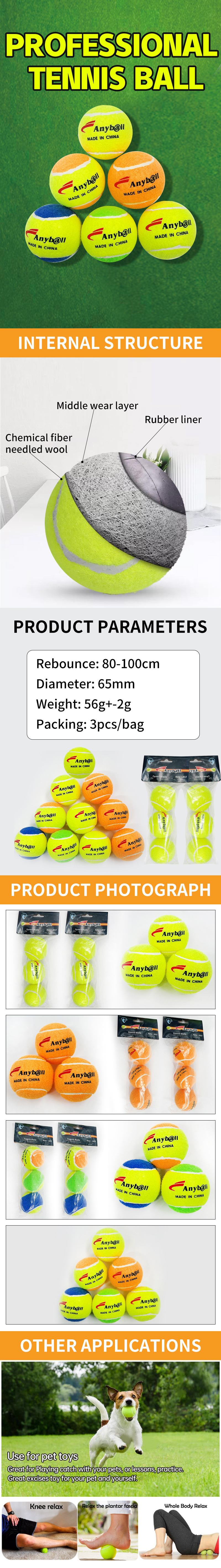 Our tennis balls are all Anyball brand, the material is mainly rubber+polyster felt, rebounce about 80-100cm,dameter is 65mm, weight is 56g+-2g.