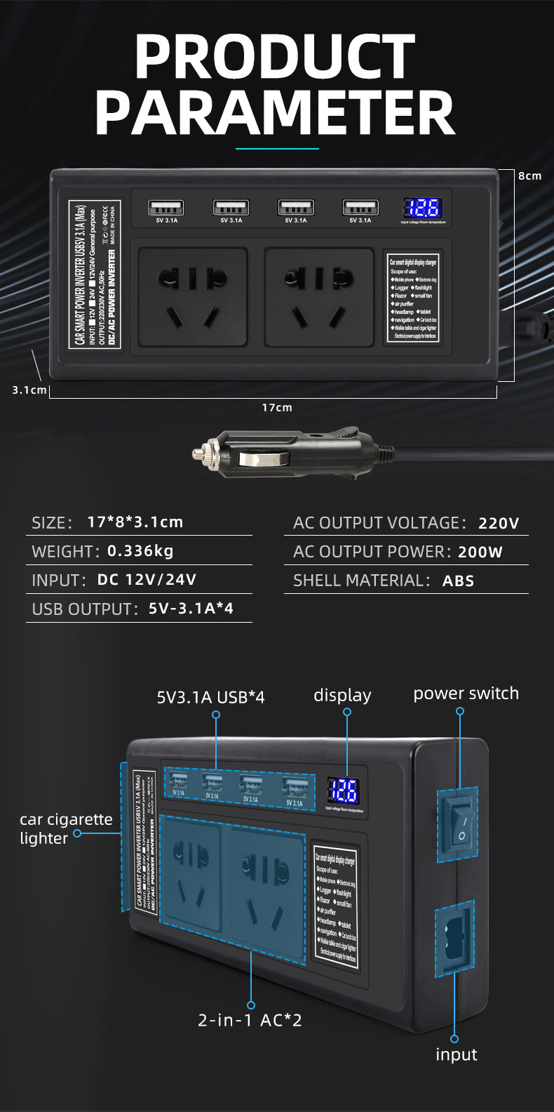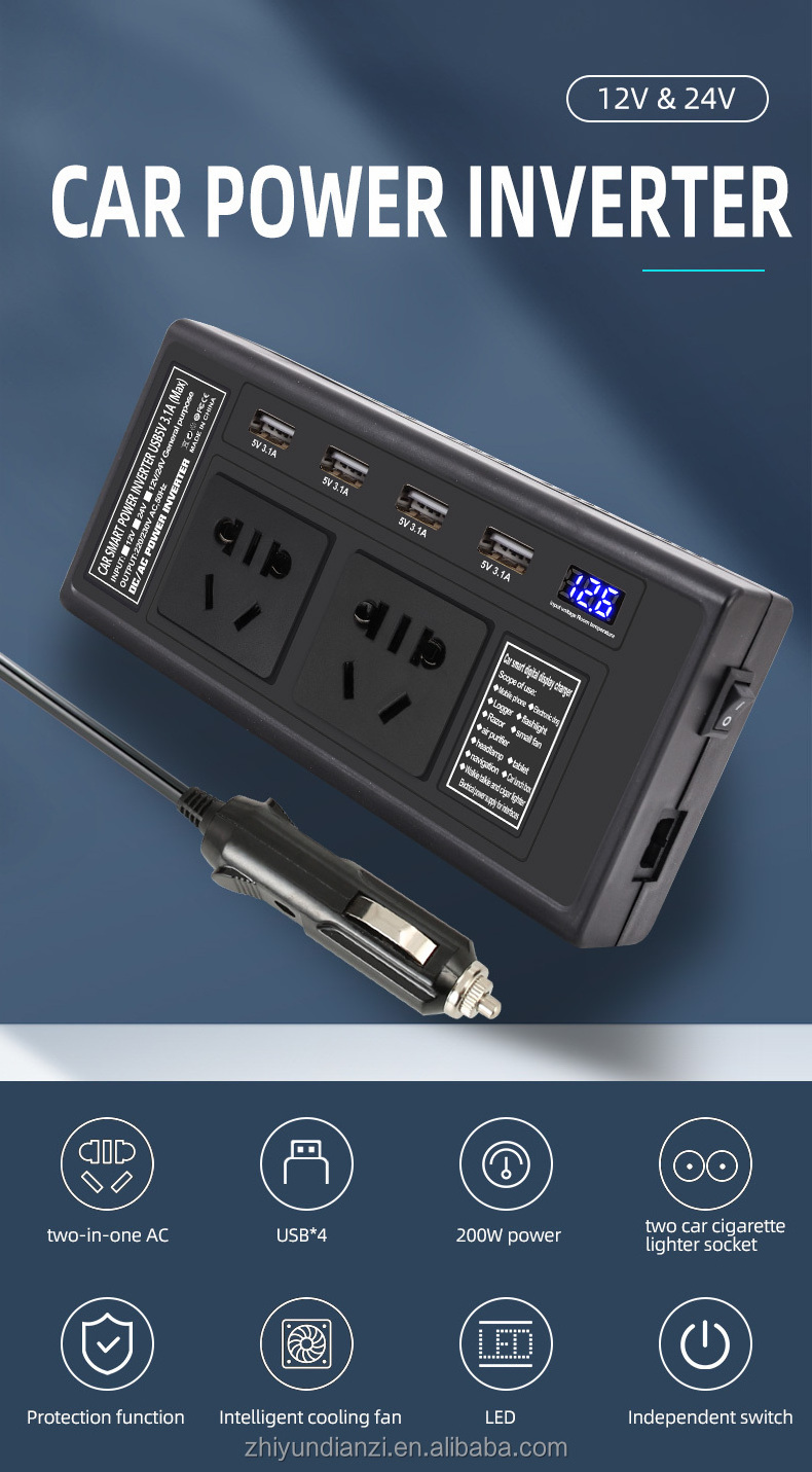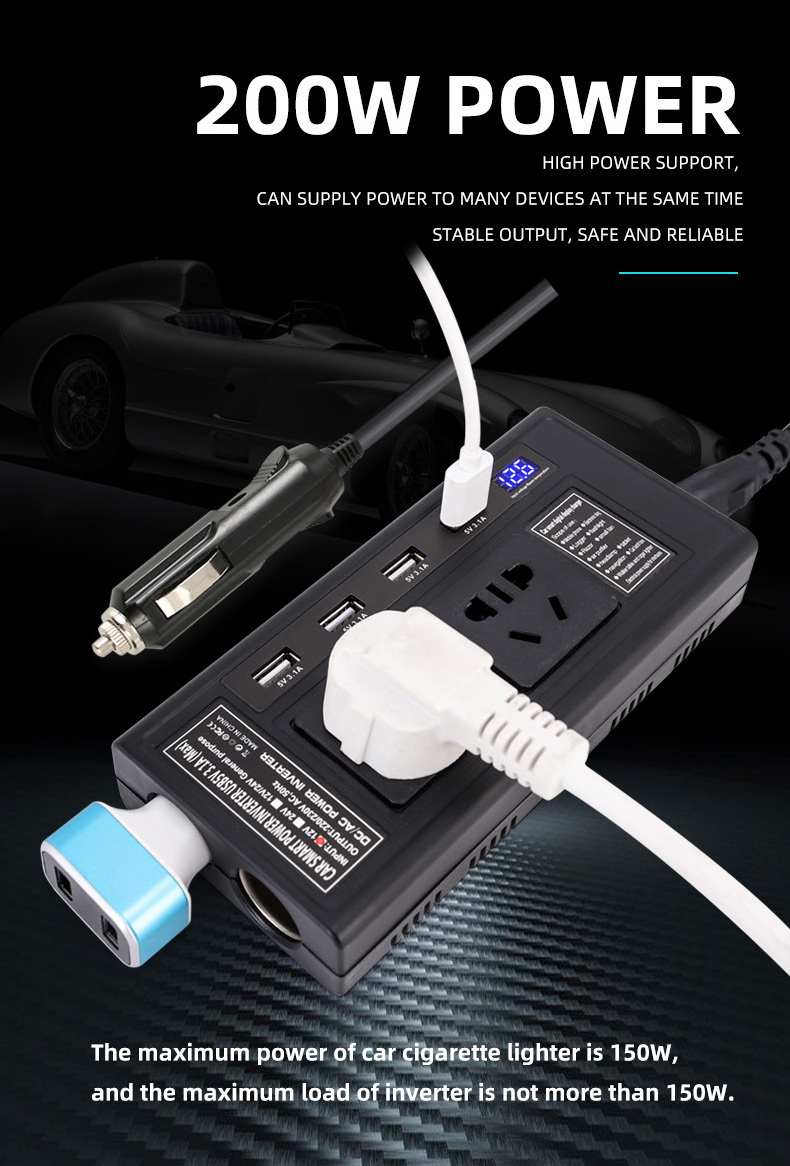 LED Display 200W Intelligent Car inverter with 4 USB Ports
