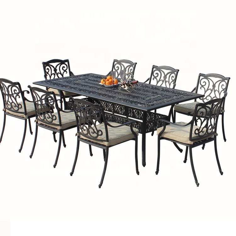 ast aluminum dining set includes one table and six chairs so you can host gatherings in comfort. Made with durable, all weather is cast aluminum and designed with the details in mind.