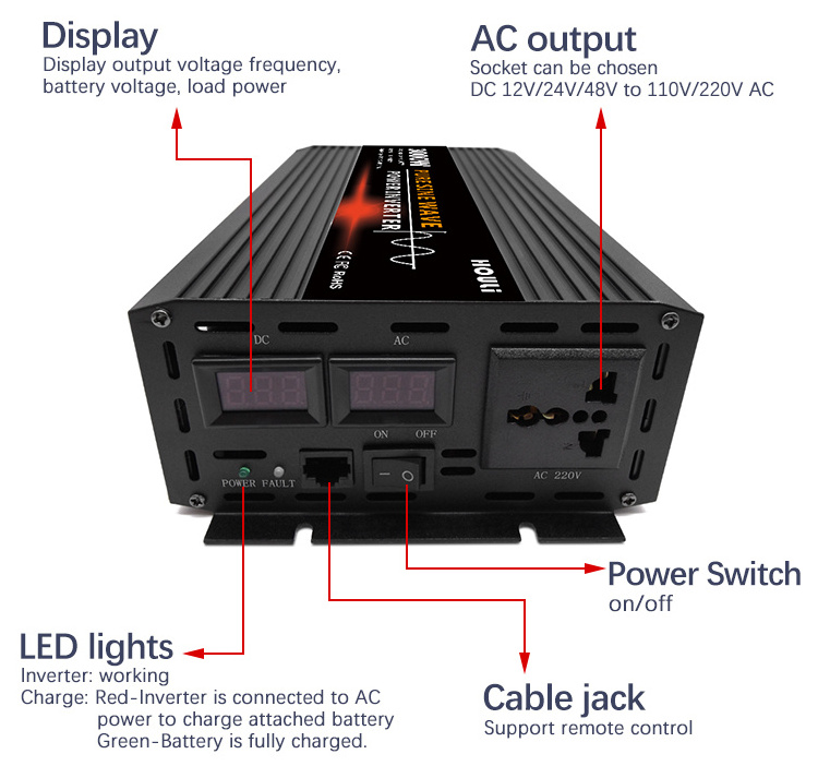 1. Pure sine wave, intelligent filter, does not interfere with electrical appliances, protects electrical appliances. With high conversion efficiency (up to 95%), the low power consumption of the product itself can greatly extend battery life.