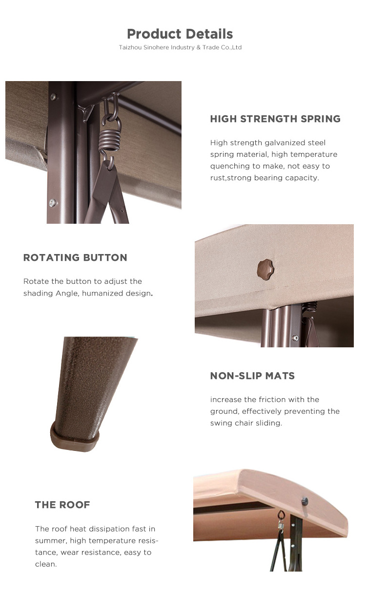 Sinohere was established in 2008, we specialize in producing outdoor leisure products, include outdoor umbrella, gazebo ,swing chair, folding tables,outdoor furniture and so on. The mainly market are from Europe and America,customers include large supermarkets, importers, e-commerce, etc. Our factory covers an area of 12,000 square meters. Independent with the whole process of advanced production equipment, can provide a variety of certifications. There have more than 120 production workers, 10 R &D and testing staffs who have strong production capacity and research and development ability to independently research and develop new products, so we provide OEM, ODM services. Sinohere through the exhibition and e-commerce platform to establish a close relationship with overseas customers and win the recognition of customers with efficiency and professionalism. The R & D department keeps up with the product trends and constantly introduces new products. Production workers will accept regular training. Inspectors track product quality throughout the process to ensure that every screw is of high quality. customer service will offer pre-sales, sales, after-sales service so that the majority of total customer satisfaction has always been our goal. Taizhou Sinohere Industry & Trade Co., Ltd. is willing to cooperate with you to create a better life.