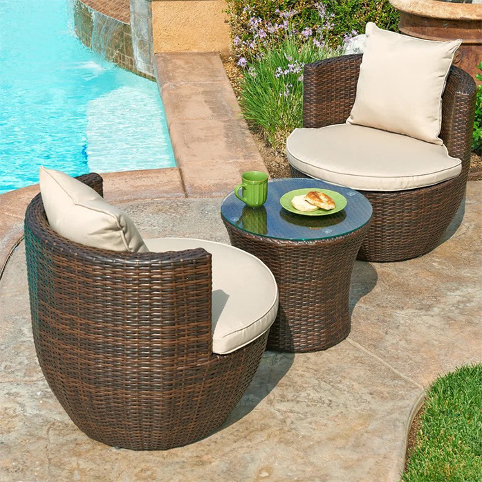 - This stylish and practical rattan table and chair set will be a perfect place to rest when you want to relax and embrace the sun in a garden, balcony, or terrace. The delivery includes 1 table, 2 chairs, and 2 seat cushions.
