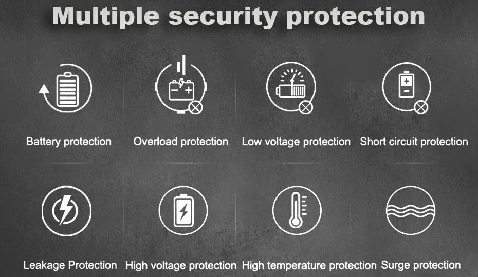 Pure sine wave, intelligent filter, does not interfere with electrical appliances, protects electrical appliances. With high conversion efficiency (up to 95%), the low power consumption of the product itself can greatly extend battery life.