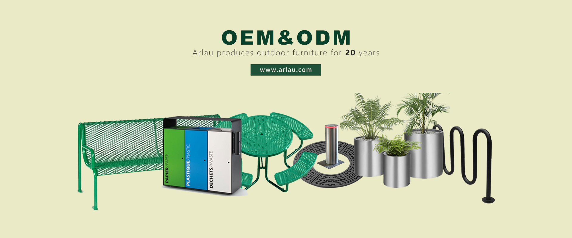 The Arlau outdoor furniture brand started in Shenzhen China in 1999, specializing in the R&D, manufacturing and sales of outdoor furnitures. The factory has more than 22 years of successful management and production experience, and its products are exported to more than 80 countries and regions home and aborad. The main business refers to manufactuer and sale for trash cans,benches,flower boxes, outdoor tables & chairs, barricades, bicycle stands, tree grates and other outdoor furnitures as well. The company has established a fully automatic robot production line and a line of thermoplastic coating process, with an annual output of 130,000 pieces.