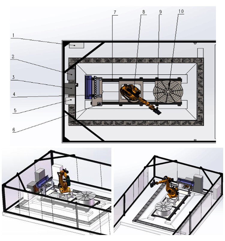 The rotary table is a single-axis positioner, which is mainly composed of a positioner frame, a servo drive motor, a precision reducer, a turning plate, a lifting roller frame, a fixture and a control system. Among them, all welded structural parts are assembled by steel plates and profiles. All welds are welded according to the requirements of equal-strength welds. After welding, they are annealed to remove welding stress and effectively prevent processing deformation. The engraving robot composes a 7-axis linkage automatic engraving system, which can greatly increase the size of workpiece engraving and increase labor productivity.