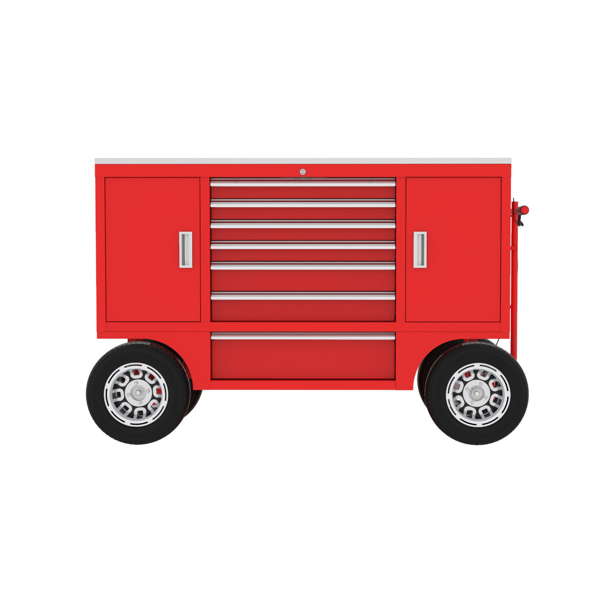* 7 Different sizes drawers for different tools * Stainless steel top provides a heavy duty work surface * Full-extension drawers use extra heavy-duty ball bearing guides * 18 inches wheels with break and direction control