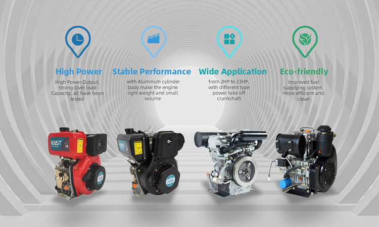 Kaist series diesel engines are small volume of four stroke compression ignition power equipments developed and produced with the newest technology. These diesel engines are designed with crankshaft 3000/3600RPM power output devices, including single cylinder air cooled diesel engine, L-twin cylinder air cooled diesel engine, V-twin cylinder water cooled diesel engine, V-Twin cylinder air cooled diesel engine etc.