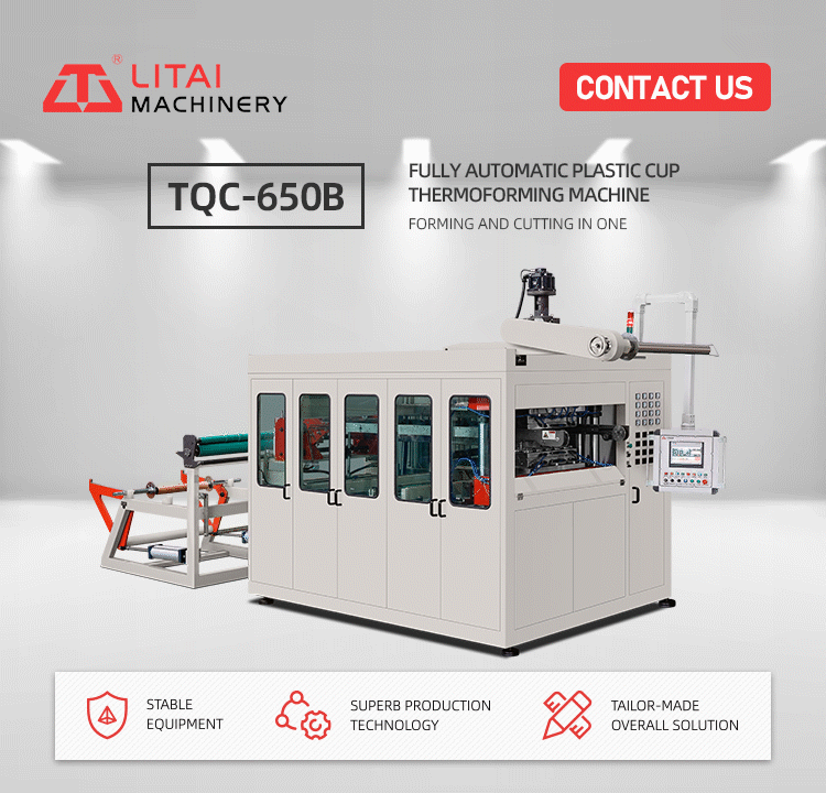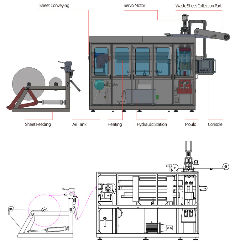 motor.Machine produces disposable products, such as plastic cup, bowl, lid, and box through the workflow of sheet feeding, sheet heating, forming, cutting and blowing, widely used and suitable for most of the customer requested. PLC for program, manual interface for operation, stable, low noise, and high efficiency.