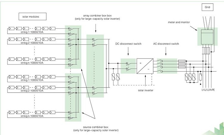 3.Equipment such as combiner box and DC cabinet are required to have the following functions:disconnection, surge current protection, surge voltage protection and accidental insulation damage monitoring of equipment.
