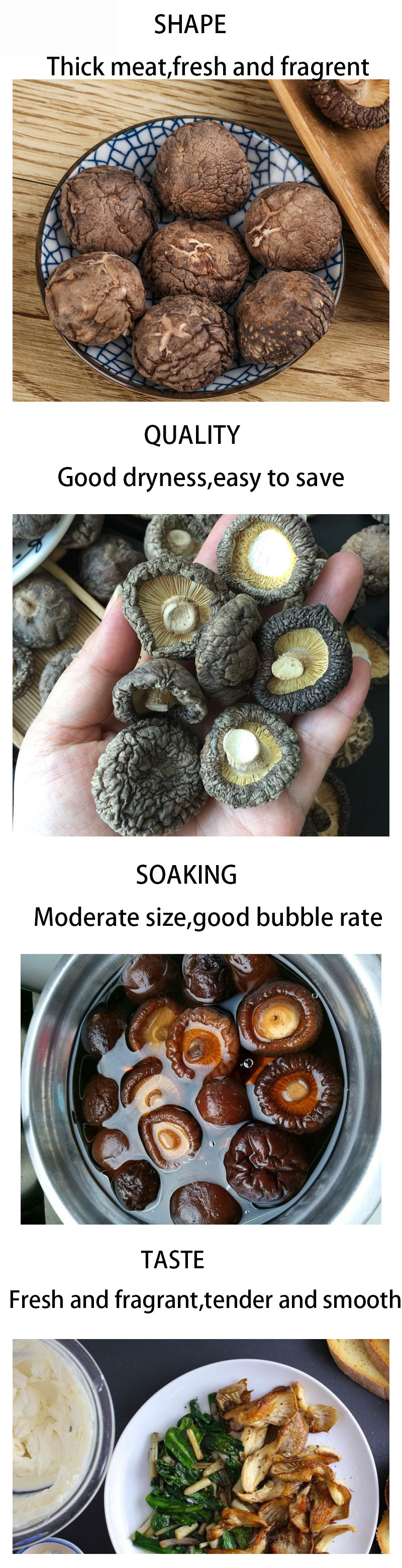 kinds of enzymes, it is known as the "king of vegetables". Dried shiitake mushrooms are processed from fresh shiitake mushrooms by roasting and other processes. Since fresh shiitake mushrooms form a large amount of guanylic acid during the drying process, dried shiitake mushrooms taste more beautiful and are easier to store. Shiitake mushroom is the second largest edible fungus in the world and one of China's specialties. It is known as "mountain treasure" among the people. It is a high-protein, low-fat nutritious health food.