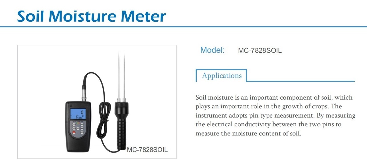 Soil moisture is an important component of soil, which plays an important role in the growth of crops. The instrument adopts pin type measurement. By measuring the electrical conductivity between the two pins to measure the moisture content of soil.