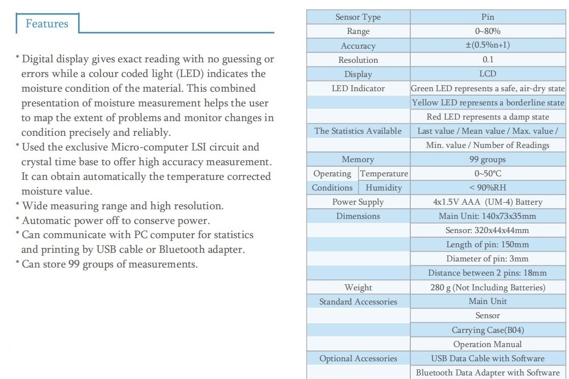 * Digital display gives exact reading with no guessing or errors while a colour coded light (LED) indicates the moisture condition of the material. This combined presentation of moisture measurement helps the user to map the extent of problems and monitor changes in condition precisely and reliably.