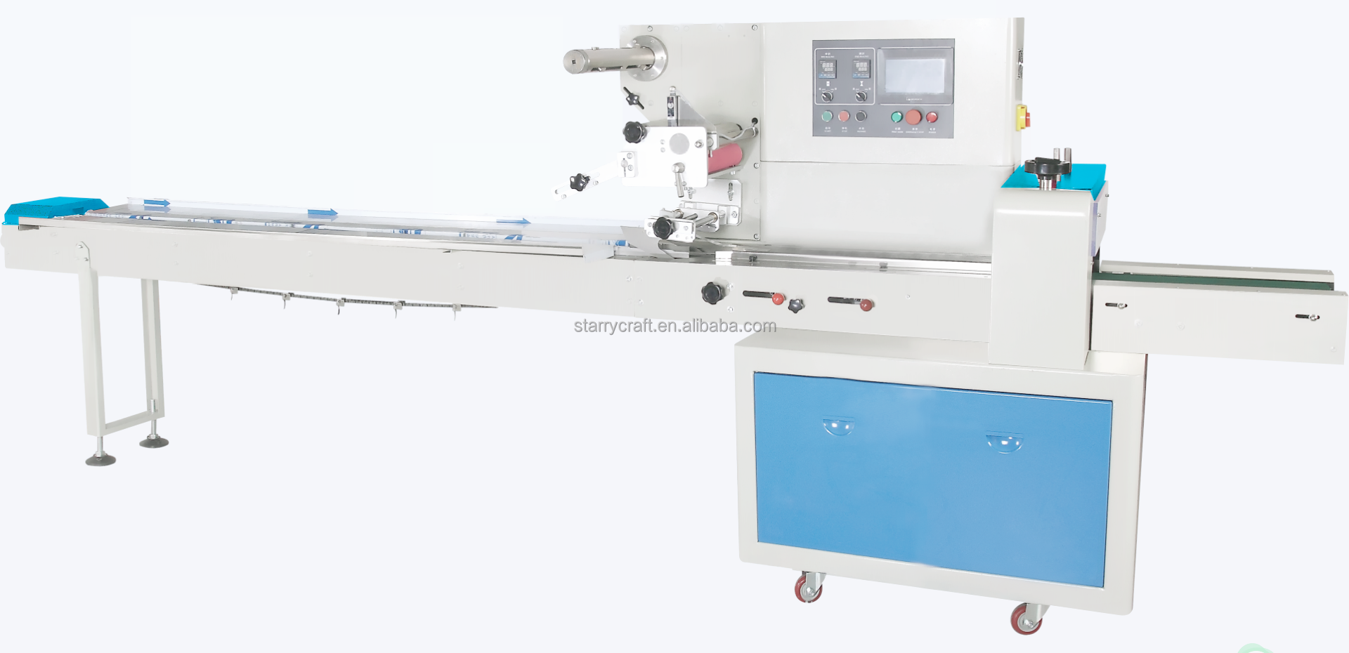 This machine is designed for packing fixed shaped materials into pillow packages, suitable for packing all kinds of regular shaped solid products, including foodstuff, such as biscuits, breads, moon cakes, candies etc, commodities, industrial parts etc. For small pieces and separated articles, they should be put in to boxes or tied into blocks before this machine can be used to pack them, and this packing method is also applicable to pack other non-solid products.