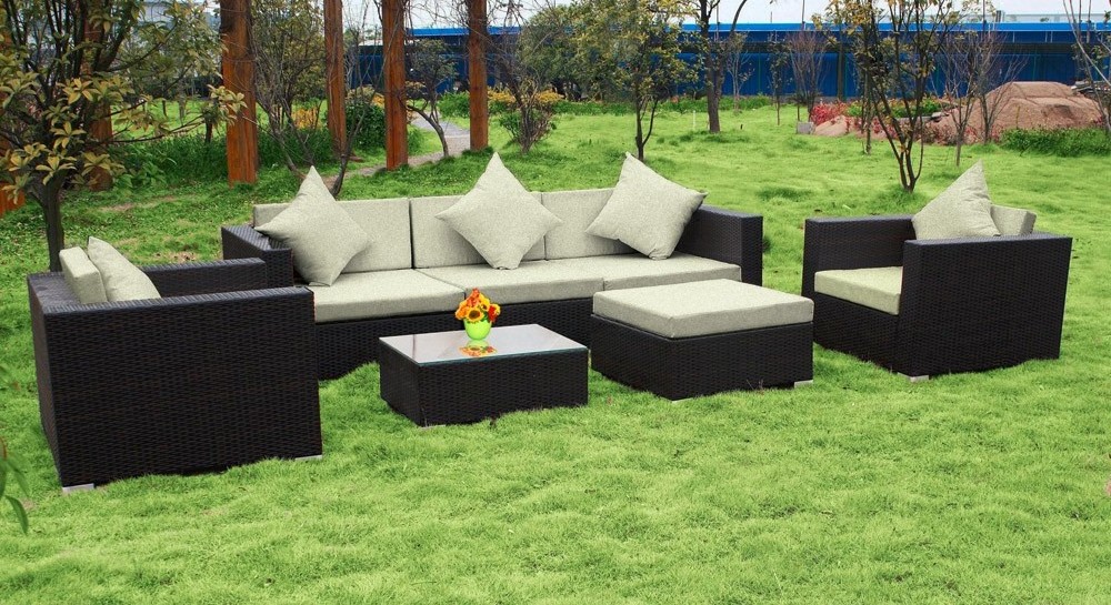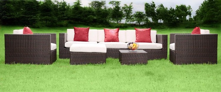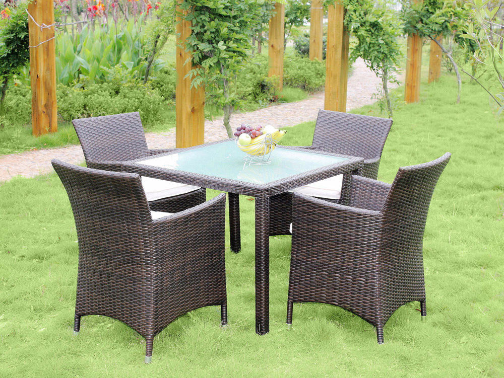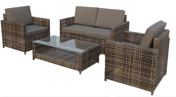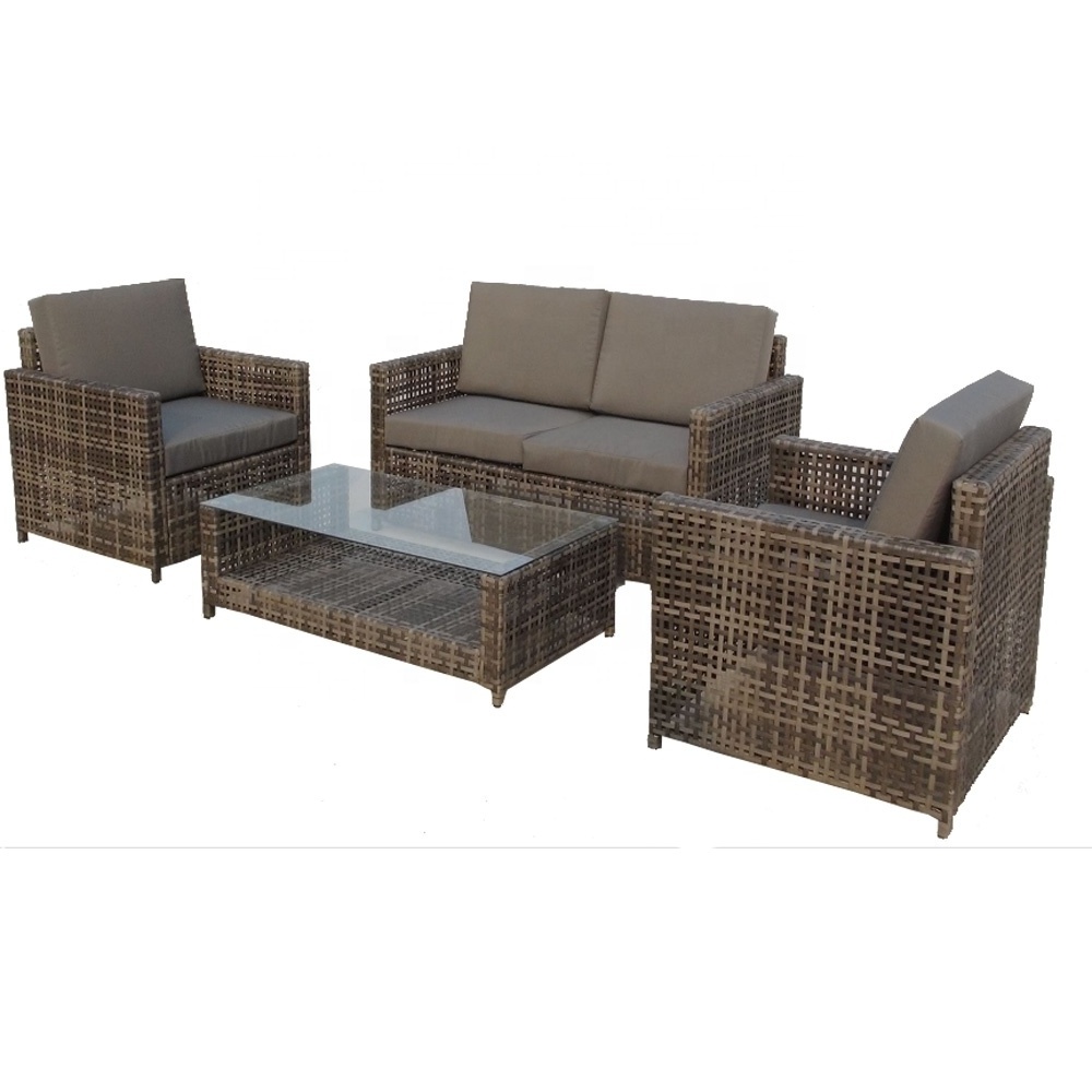 Steel frame with powder coated,table top with 5mm clear Tempered Glass,Cushion:10cm,Fabric:160g polyester Rattan:PE rattan