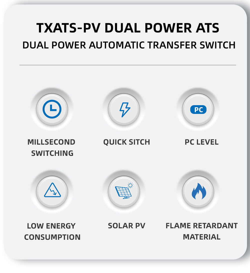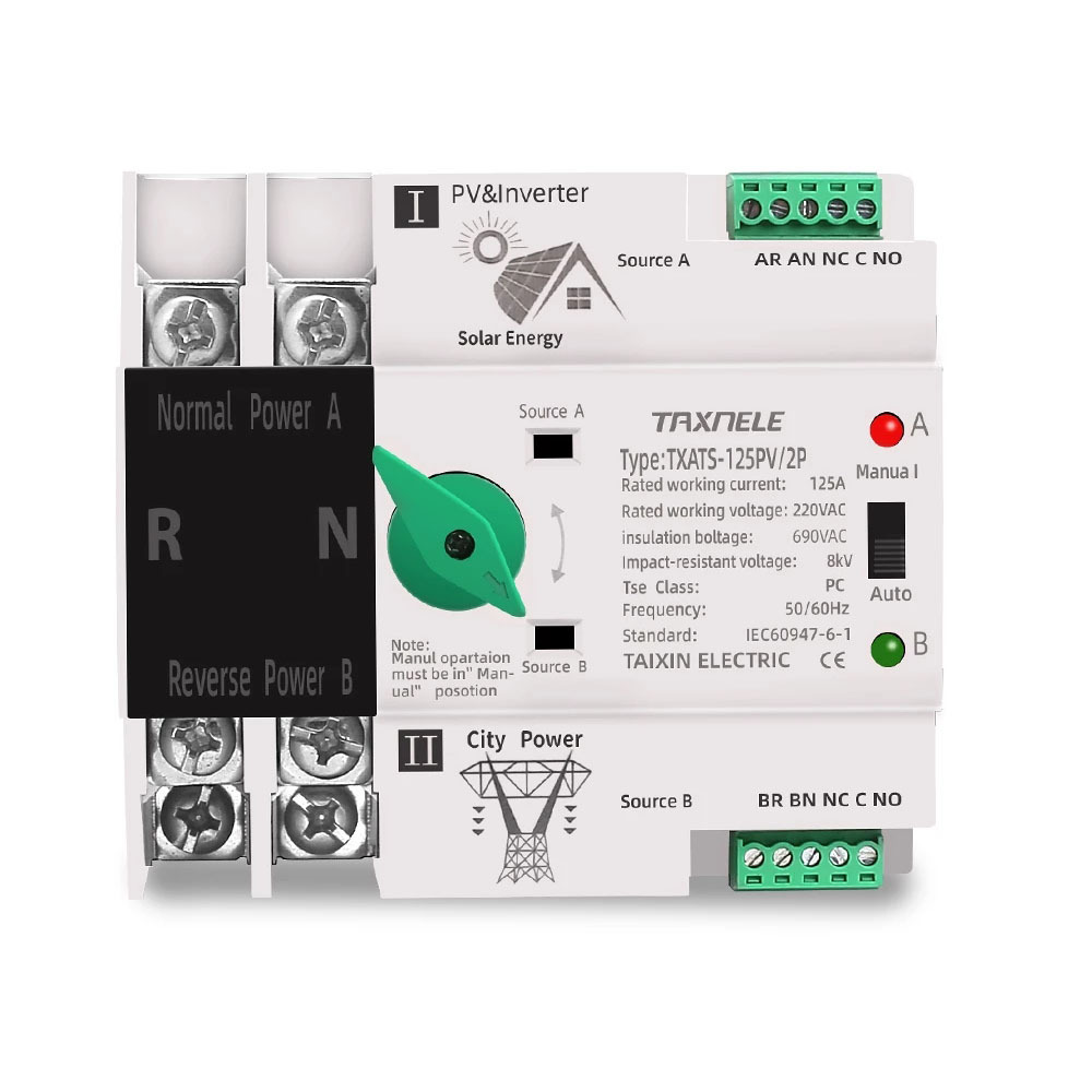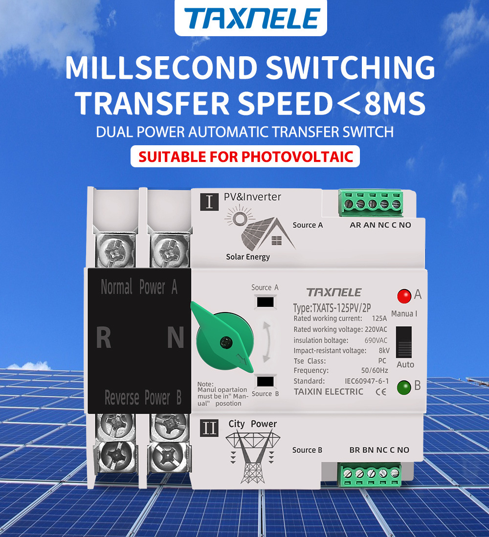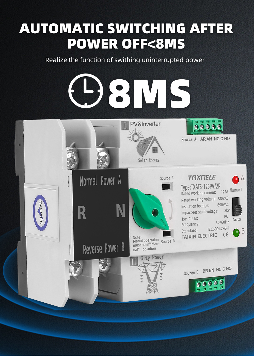 PV Inerter type have to connect Inverter for SourceA, Inverter and PV system as main power. Only for for PV system and Inverter to city power, not for City Power and Generator to City Power and Generator. Dual PowerAutomatic Transfer Switch. PC level, Switch less than 8ms, no Interrupt. |