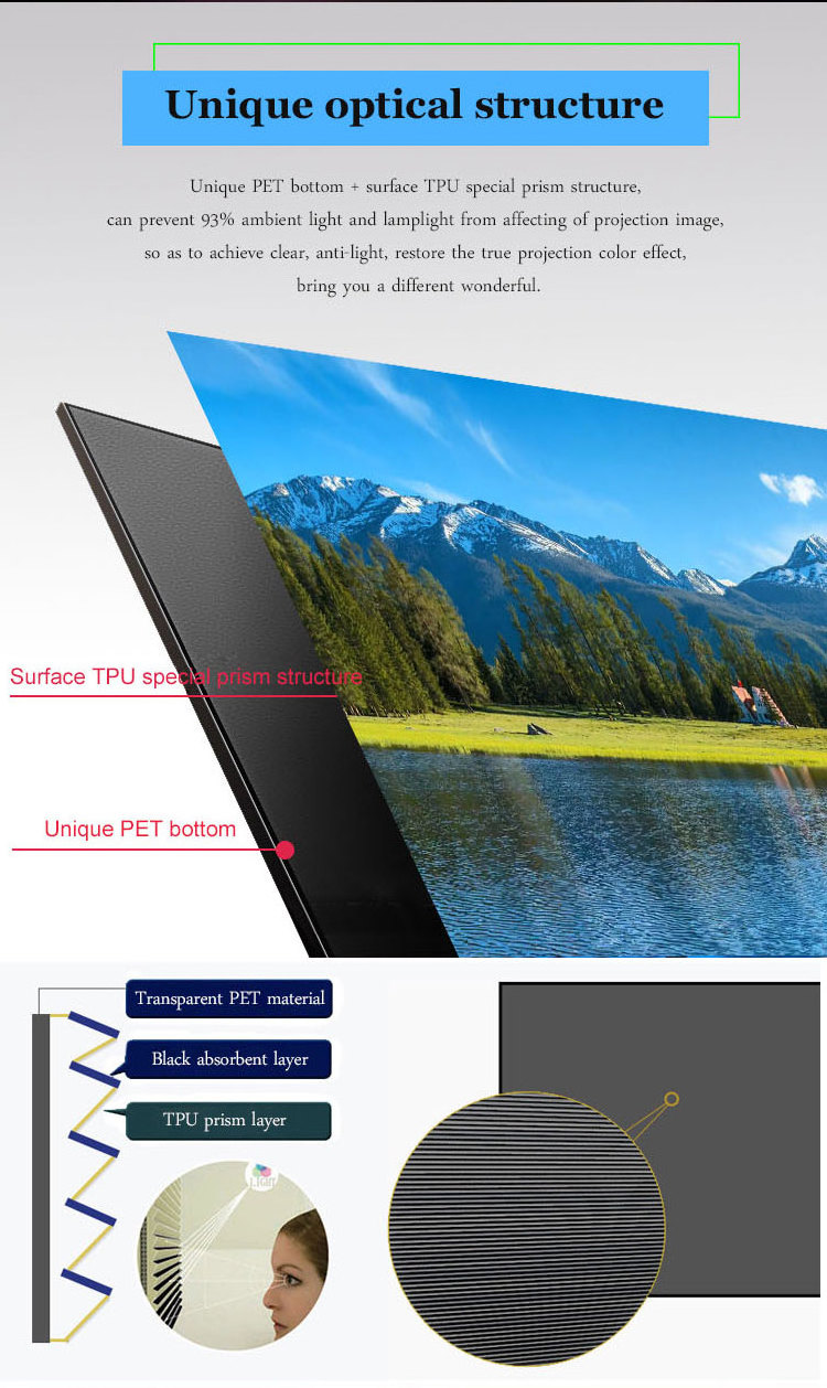 We know projection and ambient light in the room do not go together well. ultra-short-throw PET black crystal fabric projection screen can improve the situation,