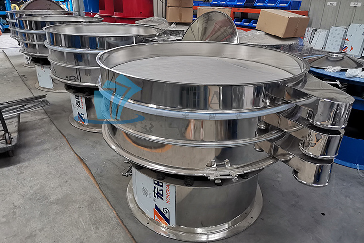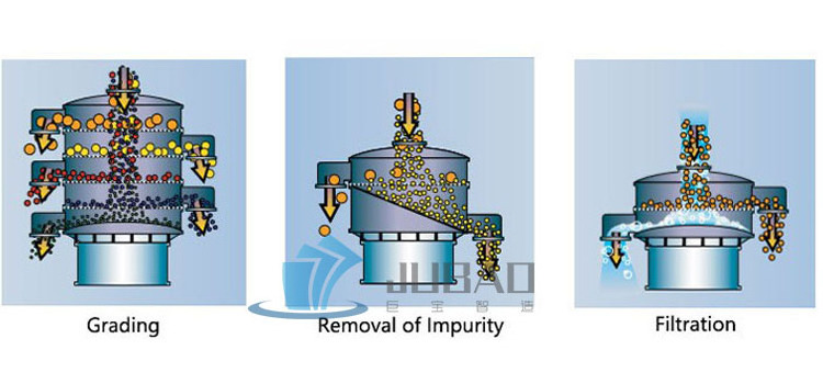 is one kind of round rotary vibrating screen. With different mesh size screen, it can sieve or grade different mesh size powder or granules. One layer for 2 size sieving grading, two layers for 3 size sieving grading, etc. With different sieving requirement, there are different machine material for choice, like full stainless steel, contact part stainless steel and full carbon steel etc., as per different sieving standard, you can choose sus 304, sus 316 or sus 316L for stainless steel part.