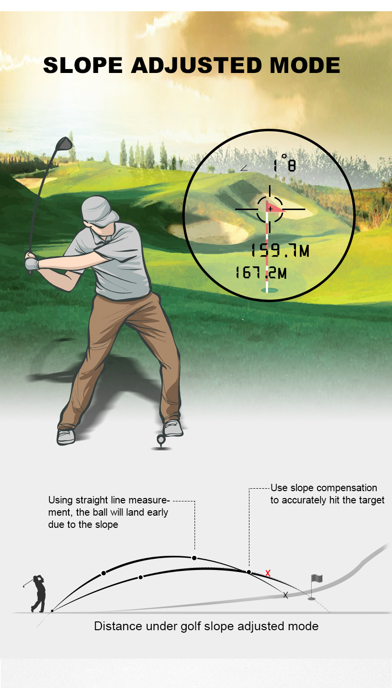 High precision golf range finder scope with slope switch and speed measuring rangefinder