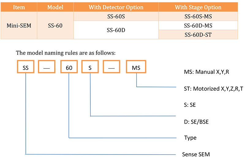 As the basic desktop SEM, SS-60 series can meet the basic experimental needs of most users. It is equipped with SE (secondary electron) detector and BSE (backscattered electron) detector. The load platform can be configured with three axes (X, Y, R). The manual platform can also be upgraded to a five-axis (X, Y, R, Z, T) automatic platform. The EDS spectrum analyzer can be configured in all series of products. The products include the following configurations: