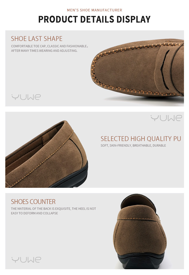 Foshan Youwei Electronic Commerce Co., Ltd., specializes in men shoes. It is located at the Footwear industrial zone , Foshan City, Guangdong Province. YUWE shoes started to do international electronic Commerce in 2021, Before this, we are already a professional men`s shoes manufacturer for over 30 years.
