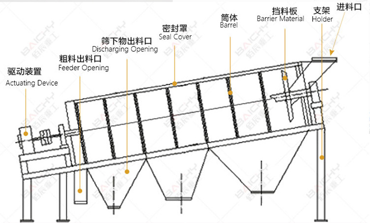| Model | Screen Diameter(mm) | Screen Length(mm) | Mesh size(mm) | Max feeding size(mm) | Capacity(t/h) | Power(kw) |