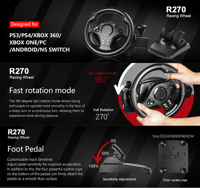 1.The newest steering wheel,Support PS4/PS3/XBOXONE/XBOX360 /Switch/Android/PC; 2.Bionics design and new processing makes it sweat-absorbed and comfortable.; 3.Strong vibration brings you the real feeling of speed and passion as F1; 4.Sole-texture-designed simulated pedal brings you back to real driving and keeps it from slipping; 5.270°steering angle makes it easily to control the game.; 6.Plug and play,stable and no offline happens.