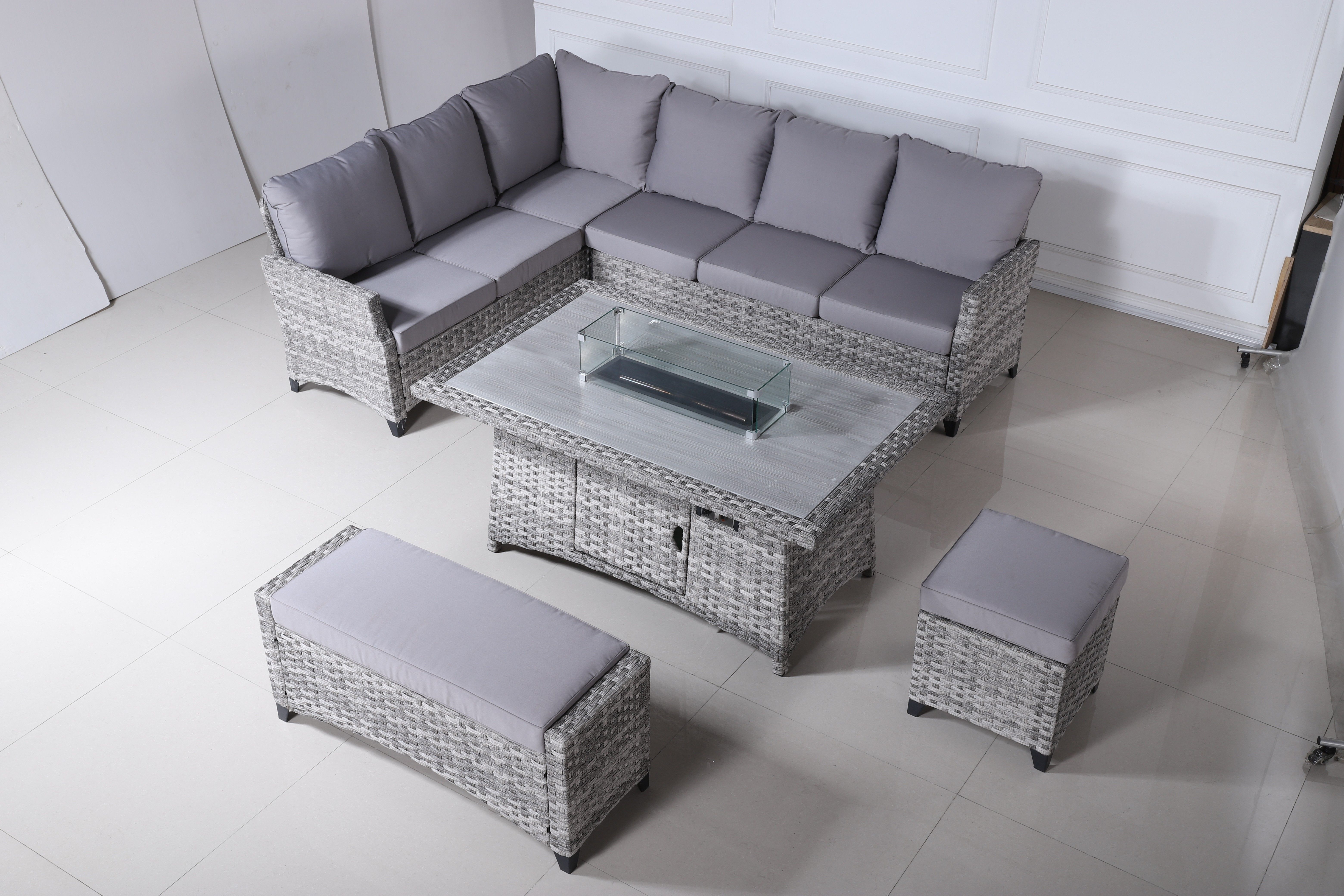Alu sofa set=one left arm three seat sofa+ one right are three seat sofa+ one long bench+ one Ottoman+ a gsa fire pit table