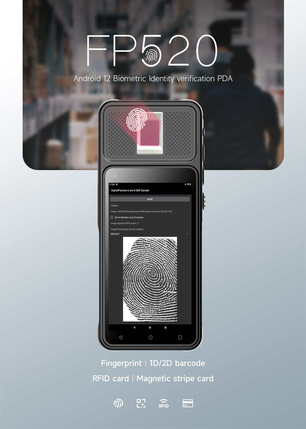 The FP520 is an Android hand-held fingerprint recognition device with a 5” HD touch screen, 8MP rear camera, support for 3G/4G/WiFi/ and Bluetooth communication, and a high capacity 7500mAh battery that can last over 8 hours at full power. The FP520 also provides an SDK and drivers for application development in java and c# programming languages. FP520 is suitable for military government fingerprint collection, personal fingerprint real name registration, fingerprint payment, and fingerprint encryption.