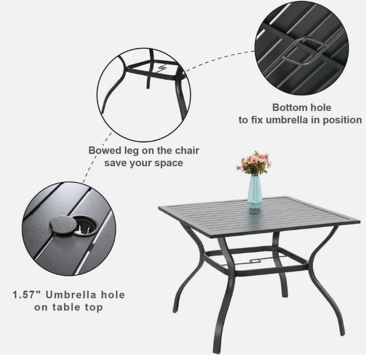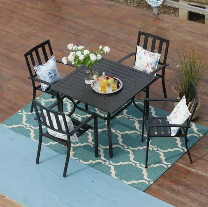 Outdoor 5 Piece Patio Dining Set Black Metal Garden Furniture Set with 4 Stackable Chairs Dining Table With Umbrella Hole