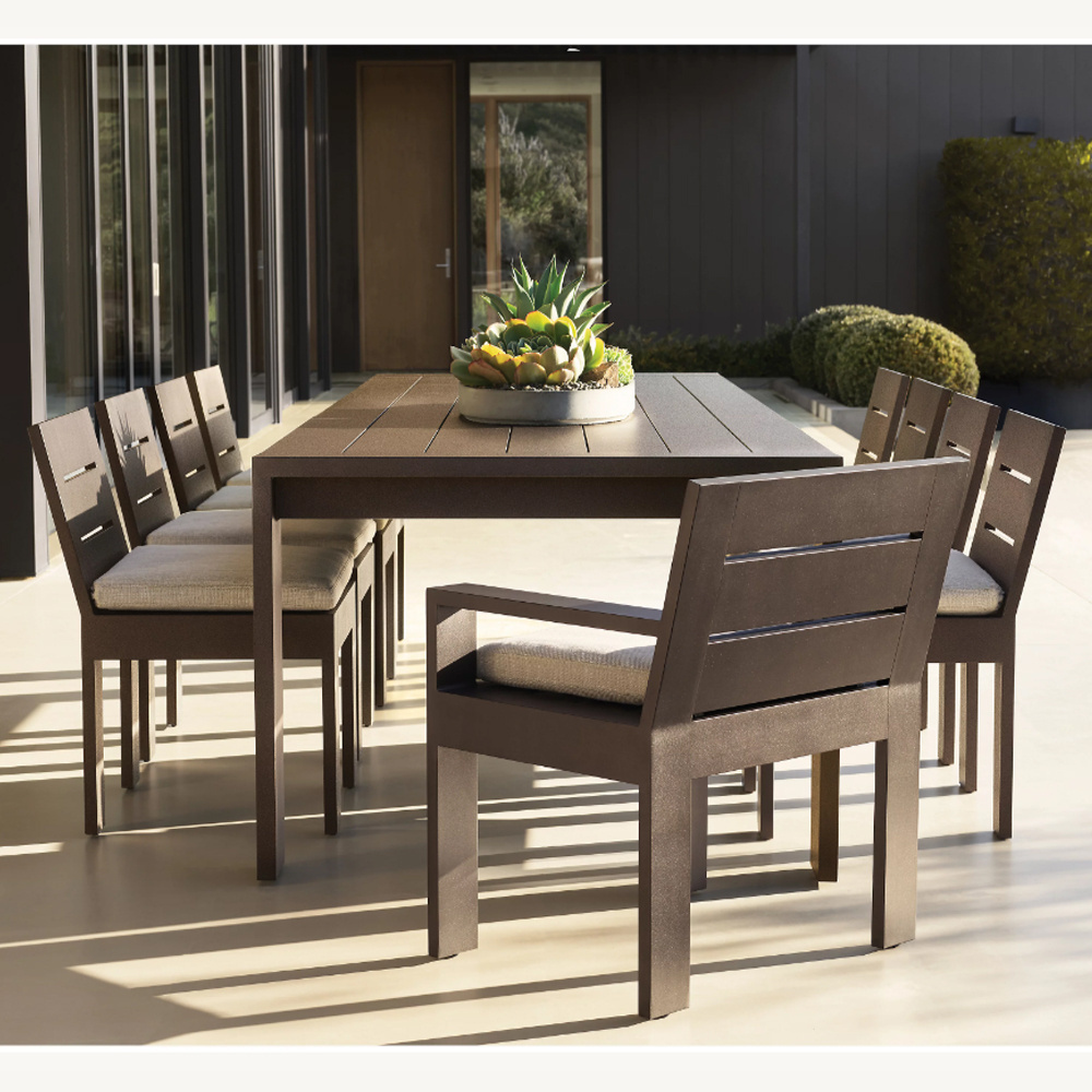 * A blend of beauty and functionality, our weather-resistant aluminum is a product of enduring design and cutting-edge technology * Hand-finished to ensure smooth edges, the frame is triple coated with a UV-inhibiting sealant that's 10 times more durable than paint * 72" and 84" tables seat up to 6 * 96" and 108" tables seat up to 8 * 120" table seats up to 10 * Our custom-fit outdoor covers (sold separately) are strongly recommended to protect furniture from the elements and minimize aging. |