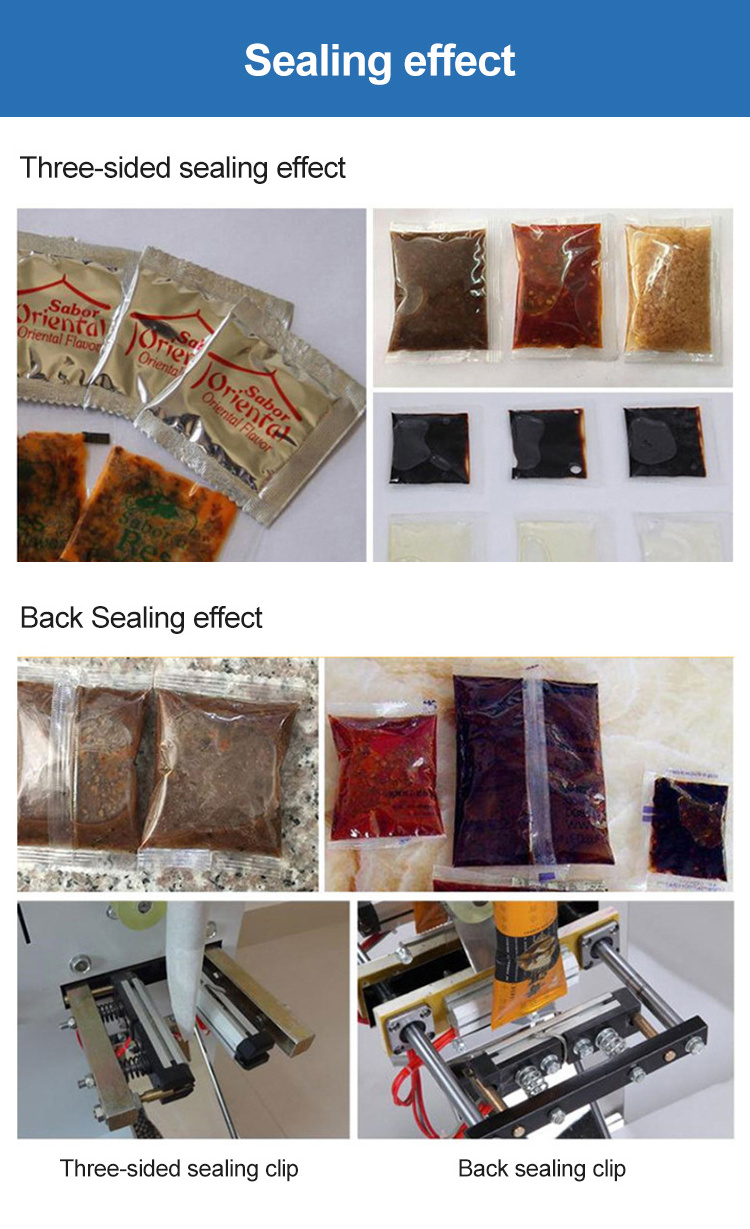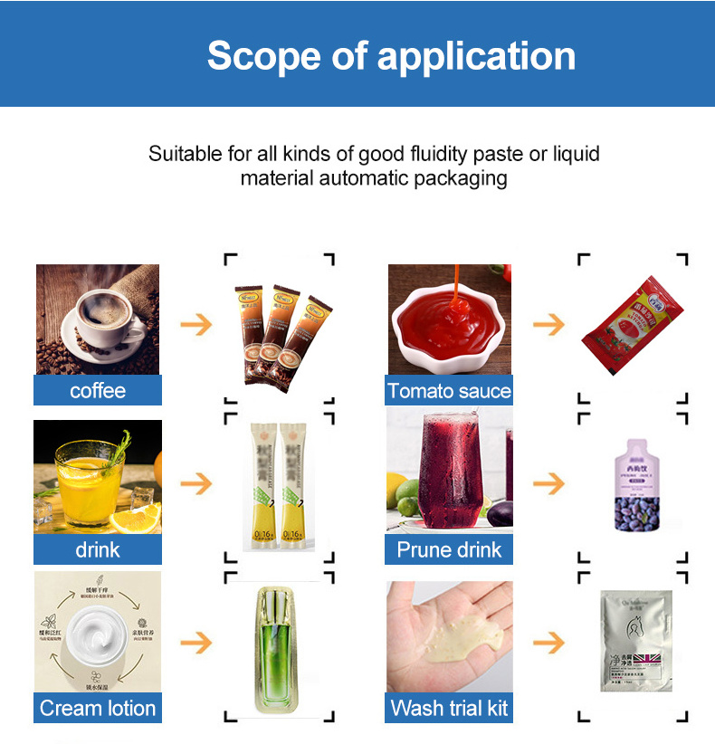 Automatic packing machine is suitable for all kinds of paste and liquid, such as ketchup, sauce, oil and so on. Suitable for plastic film, aluminum foil film. Auto complete Bag-making, filling, sealing, cutting and counting
