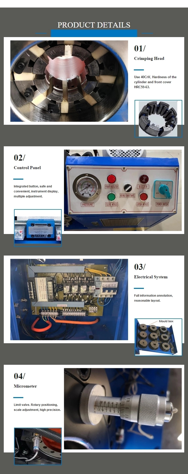 Die mould: different pressing product need different dies mould. Like air suspension ring, air conditioner hose,brake hose,hydraulic hose,cable, steel pipe,so you can tell us what you need to crimp, then we make dies mould for your products.