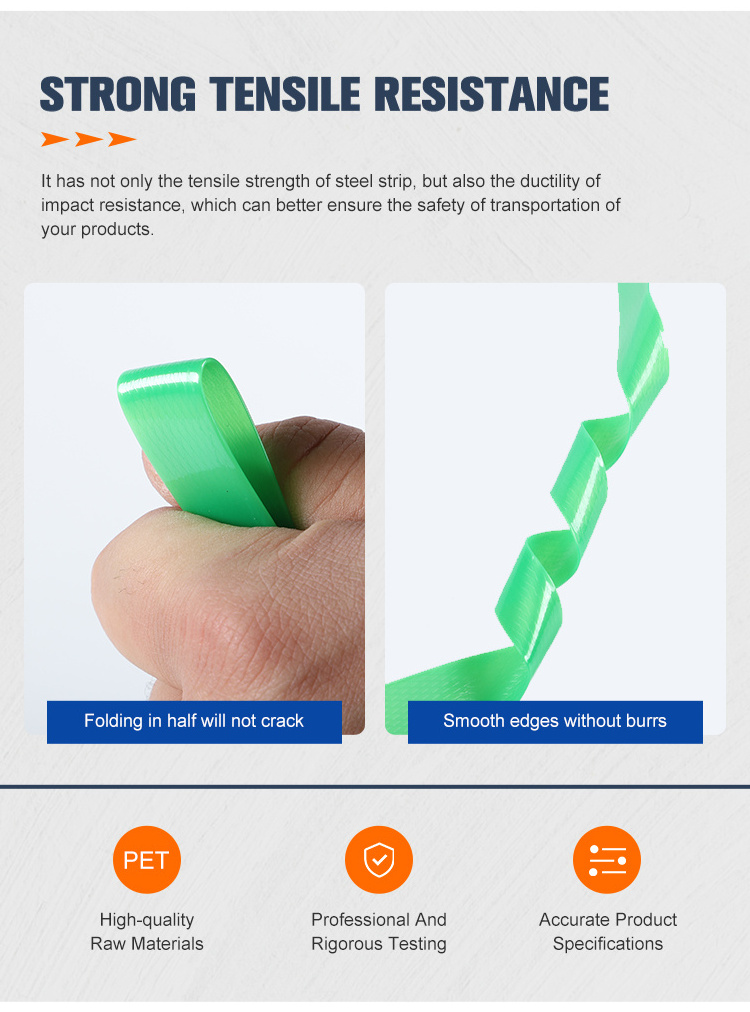 is a kind of high tensile plastic packing starp produced with PET as raw material. It has the advantages of high strength, high tensile force, good toughness, no pollution and unlimited export.