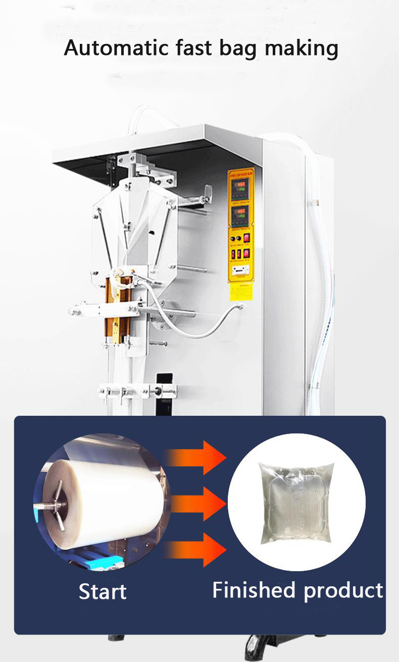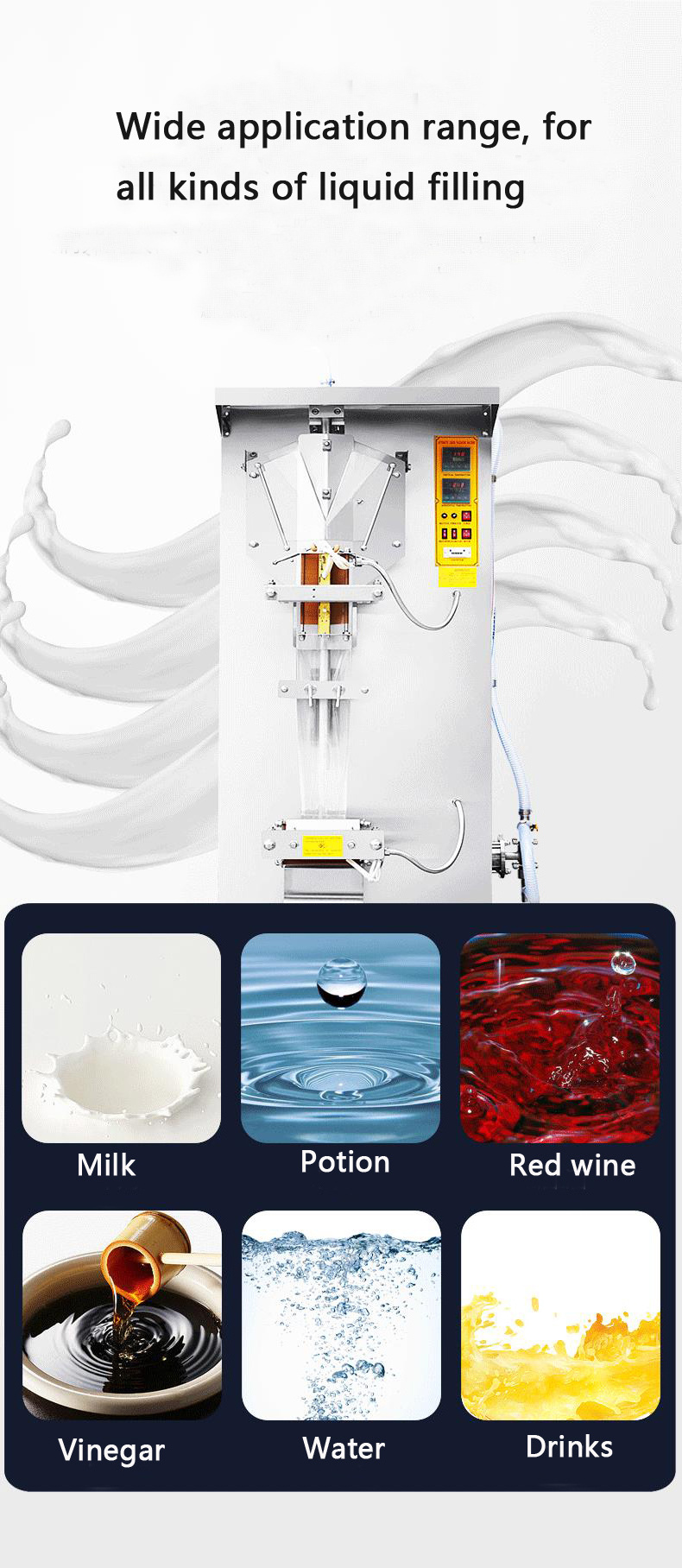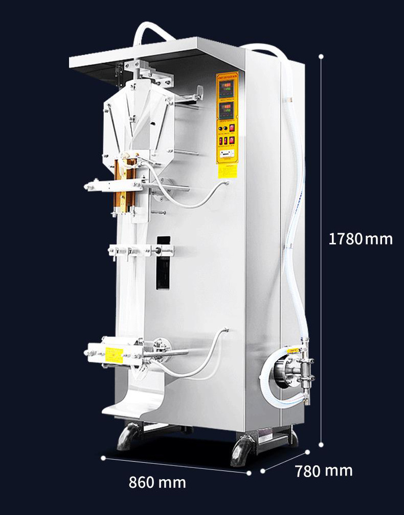 This machine widely used to pack milk、soybean milk、sauce、vinegar、yellow wine、all kind of drink with film. The whole process can be accomplished automatically, such as ultraviolet sterilization、bag figuration、date printing、quantitative filling、enveloping、cutting、counting, and so on. The temperature of heat-sealing is controlled automatically,