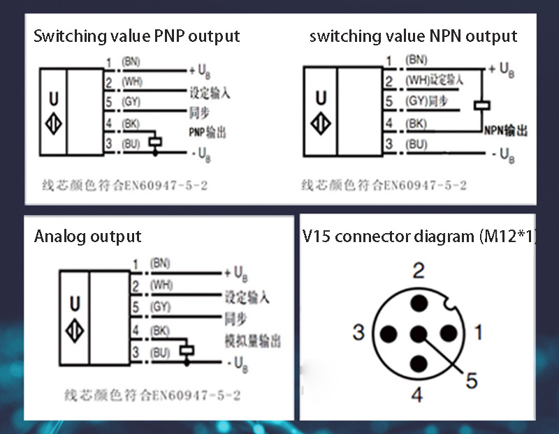 Output form: 1 analog voltage output 0-10V, 1 analog current output: 4-20mA, 1 switching output: NPN NO/NP PNP NO/NP