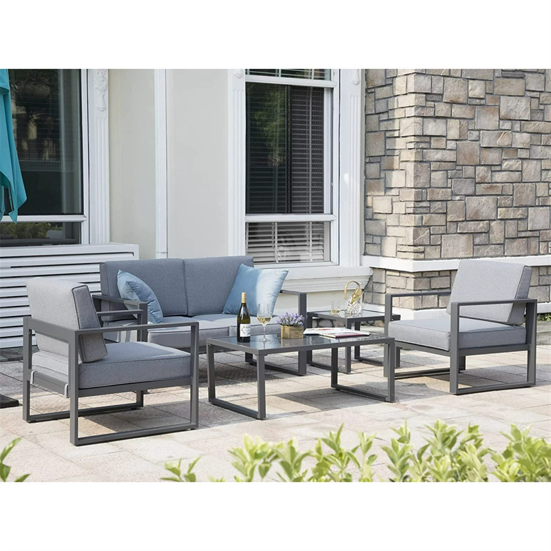 The adjustable footpads under the sofas help keep balance and prevent scratches on the floor. Outdoor furniture comes with extra plush water-resistant cushions you can not go wrong with this 5-Piece Aluminum patio set.